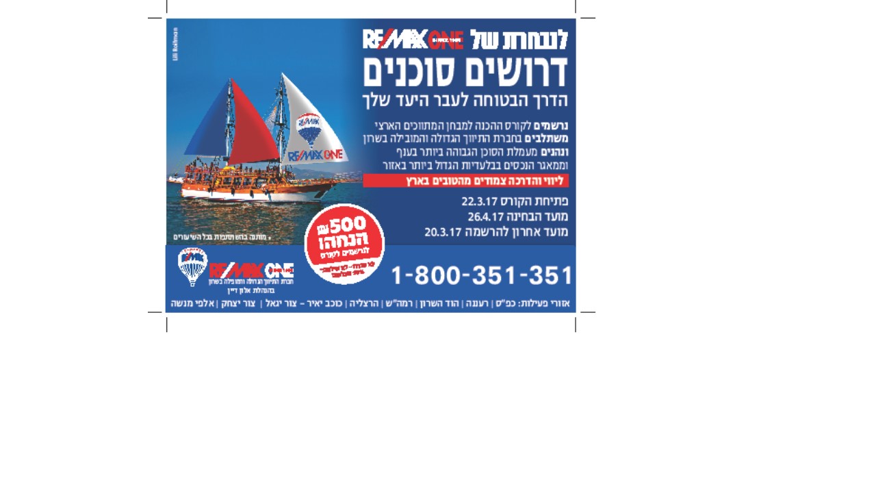 הדרך מתחילה במבחן המתווכים ! לנו יש את הקורס המתאים כדי להבטיח את ההצלחה שלך!!! מועד הבחינה הקרוב – 26.4.17 רישום לקורס הכנה למבחן יתקיים עד 20.3.17 צרו קשר : 1800-351-351 050-7941541 ענת דיין קורס הכנה למבחן יתקיים במשרדי RE/MAX ONE הקורס יועבר ע"י עו"ד גריידי הדר-מומחית במקרקעין ויכלול 4 מפגשים בשעות 16:00-18:30